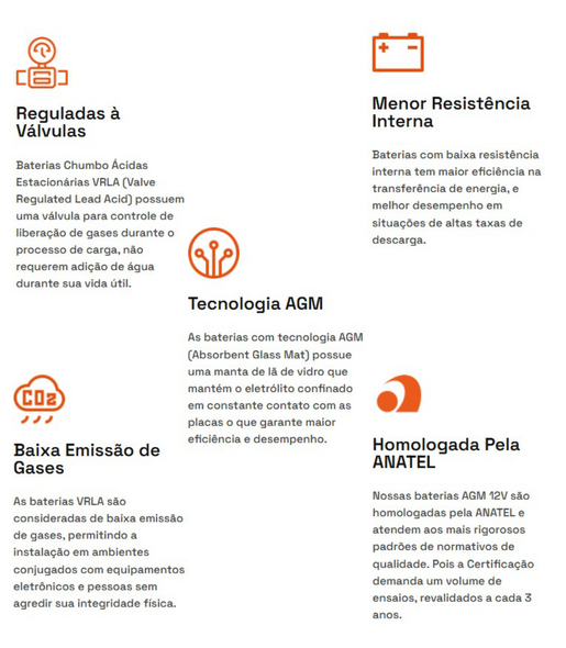 Além disso, é uma bateria selada, de baixa emissão de gases, podendo ser instalada próxima a pessoas e equipamentos, sem necessidade de manutenção. Pode ser utilizada em diversas posições, otimizando espaço sem comprometer a performance.